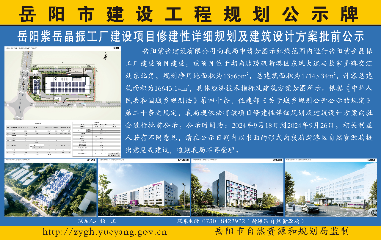 岳阳紫岳晶振工厂建设项目修建性详细规划及建筑设计方案批前公示