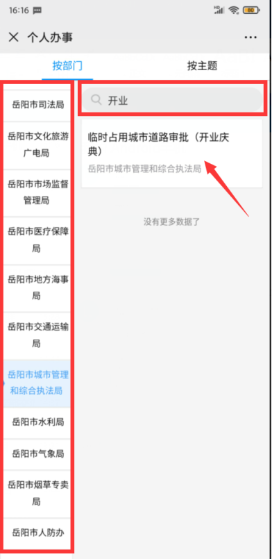 3、 进入“个人办事”或者“法人办事”办理页面后根据自己的需求搜索要办理的事项,左侧栏目为部门列表,上方空白为搜索框,右侧为相关事项。