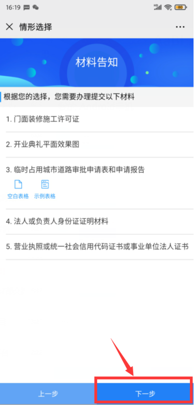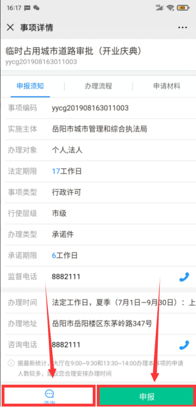 4、 以“临时占用城市道路审批”这个事项为例,选择后会打开事项信息展示页面,群众可以在此页面上查询办理此事项的申报须知、办理流程、申请材料,也可以在线咨询和在线申报。