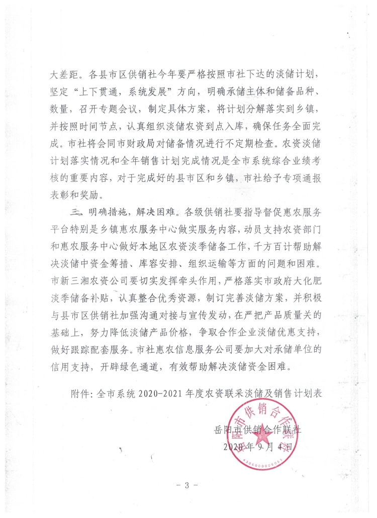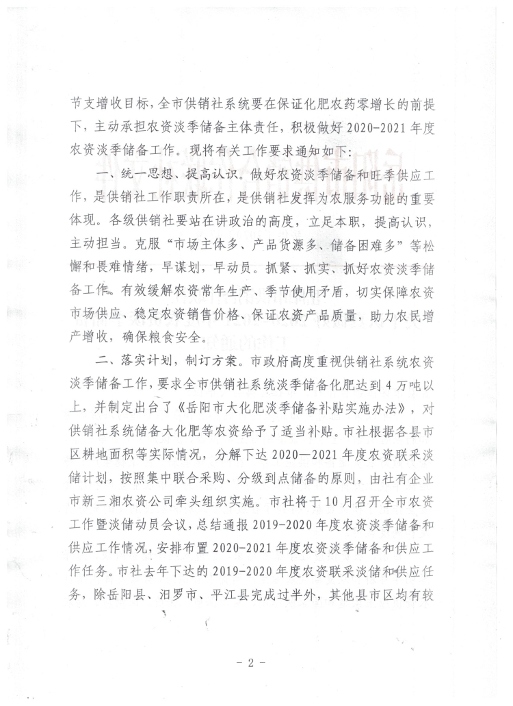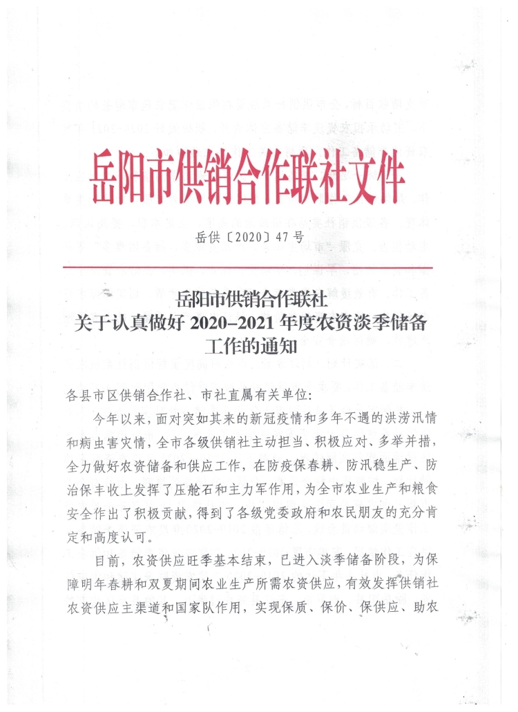 岳阳市供销合作联社关于认真做好2020-2021年度农资淡季储备工作的通知