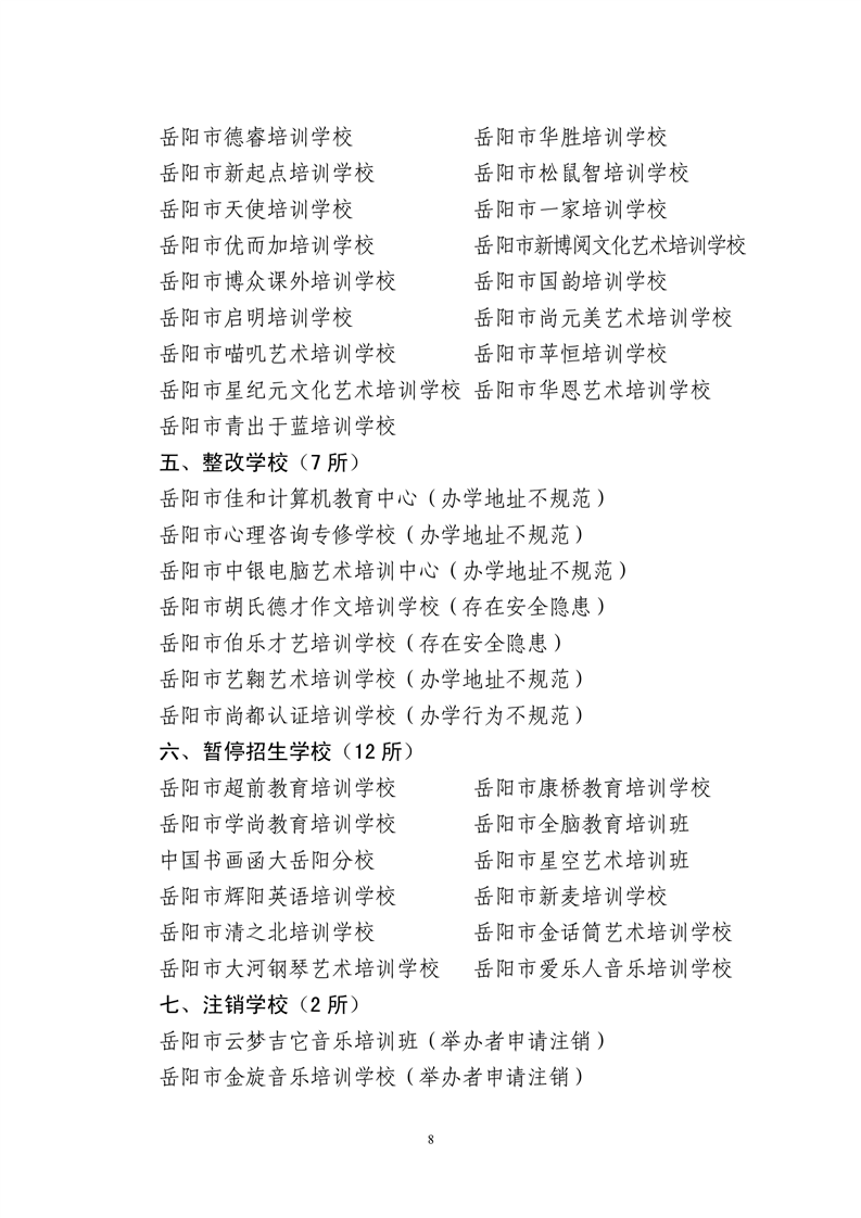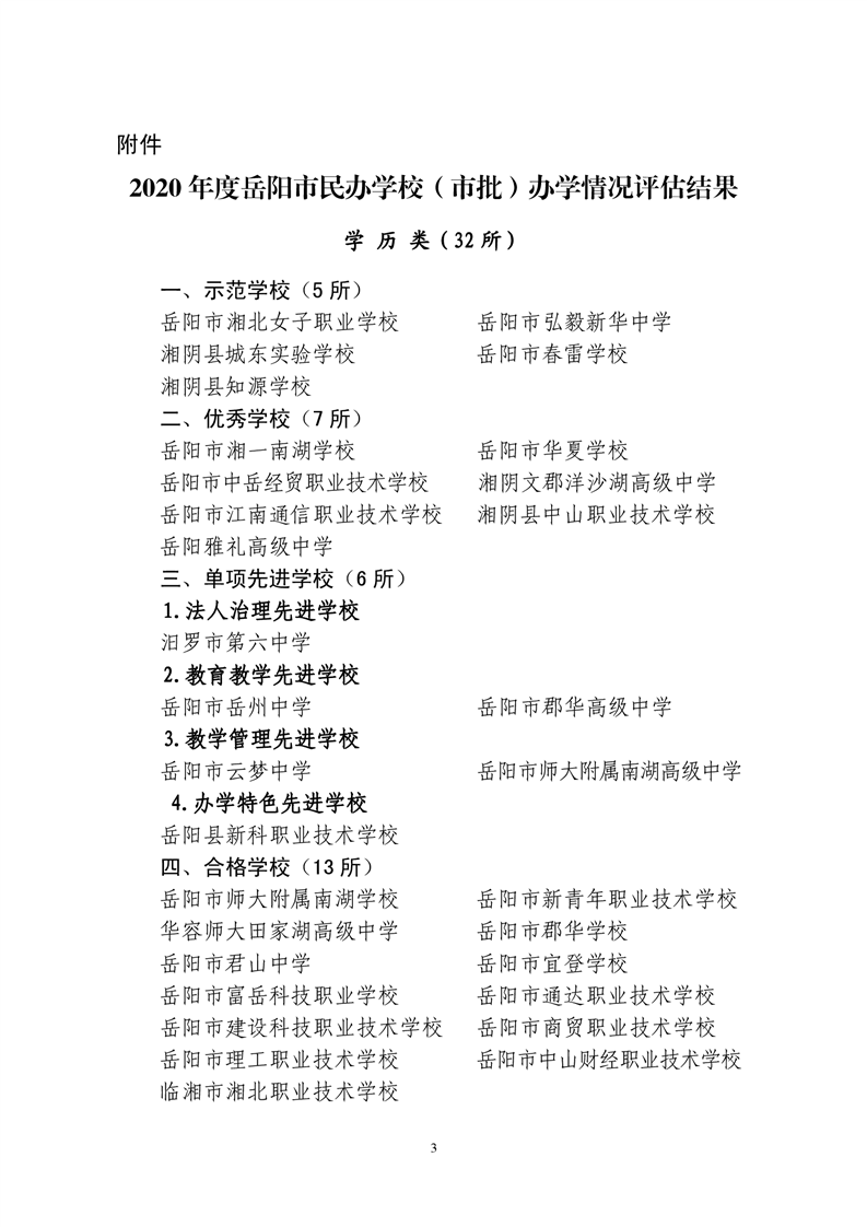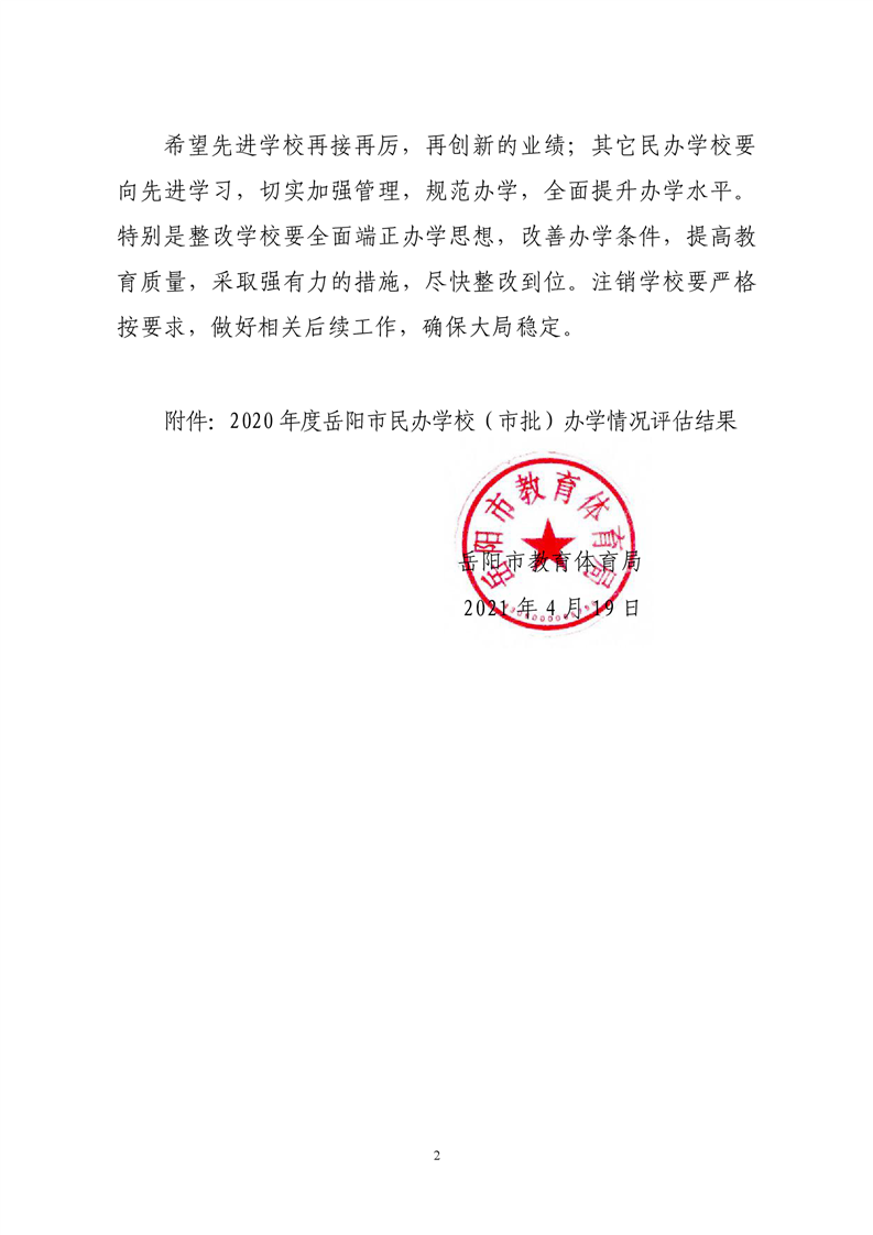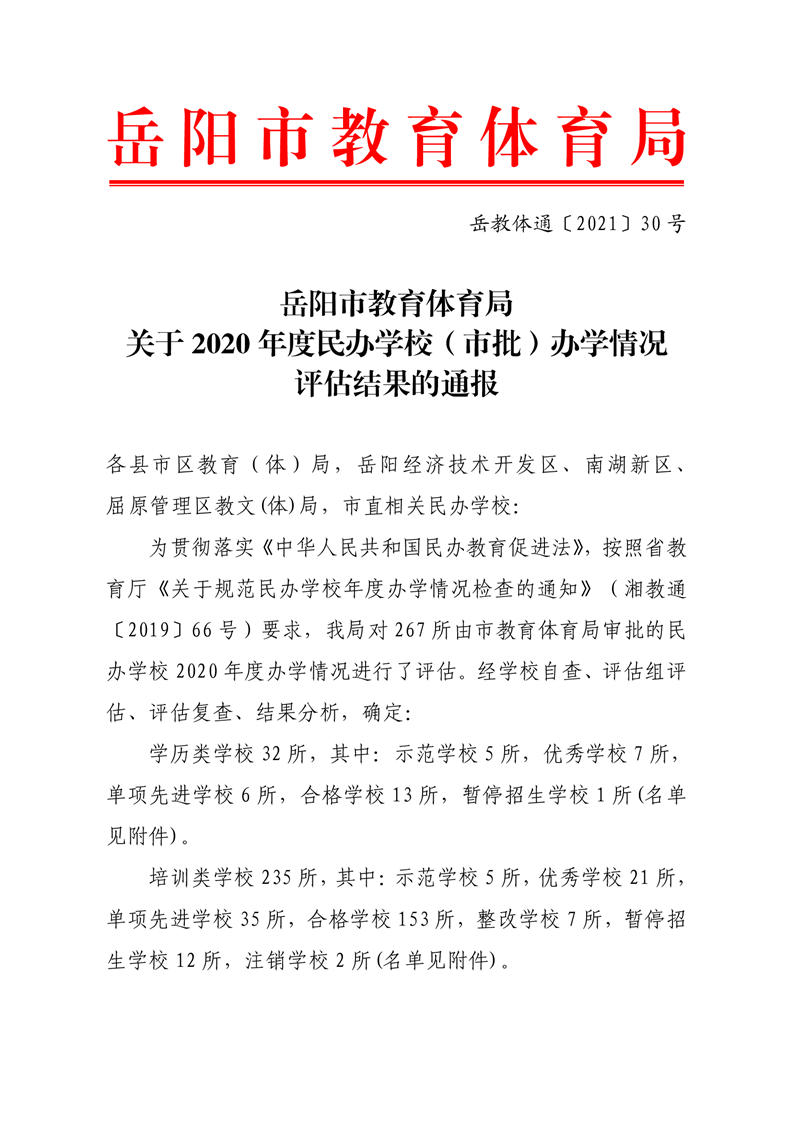 岳阳市教育体育局关于2020年度民办学校(市批)办学情况评估结果的通报(岳教体通〔2021〕30号)