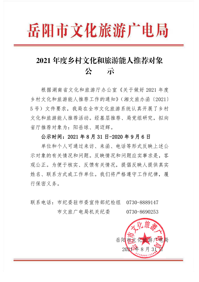 岳阳市文化旅游广电局2021年度乡村文化和旅游能人推荐对象公示