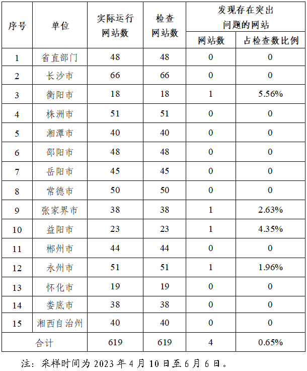 2023年第二季度,省政务管理服务局组织对全省正常运行的619家政府网站进行全覆盖检查,4家政府网站存在突出问题,总体合格率99.4%。4月1日至6月20日,全省共收到网民反馈的“我为政府网站找错”留言231条,均已按期办理,办结率达100%。94家市州、县市区政府门户网站积极响应网民诉求,实现简单常见咨询问题在一个工作日内进行回复。对全省正常运行的2450家政务新媒体进行普查,发现2家存在突出问题,总体合格率为99.9%。长沙市、株洲市、湘潭市、邵阳市、岳阳市、常德市、张家界市、益阳市、郴州市、永州市、怀化市、湘西自治州政务新媒体检查合格率100%。