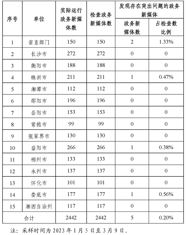 对全省正常运行的2442家政务新媒体进行普查,发现5家存在突出问题,总体合格率为99.8%。长沙市、衡阳市、湘潭市、邵阳市、岳阳市、常德市、张家界市、郴州市、永州市、怀化市、湘西自治州政务新媒体检查合格率100%。