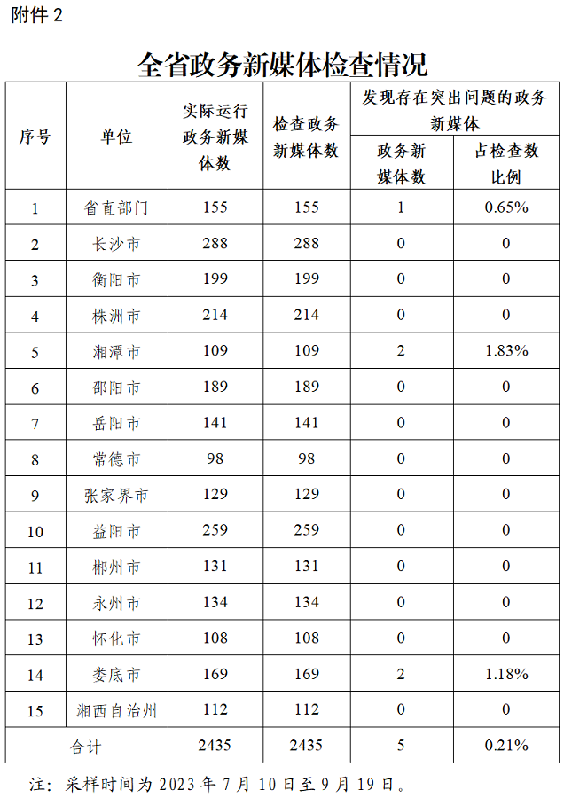 对全省正常运行的2435家政务新媒体进行普查,发现5家存在突出问题,总体合格率为99.79%。长沙市、衡阳市、株洲市、邵阳市、岳阳市、常德市、张家界市、益阳市、郴州市、永州市、怀化市、湘西自治州政务新媒体检查合格率100%。