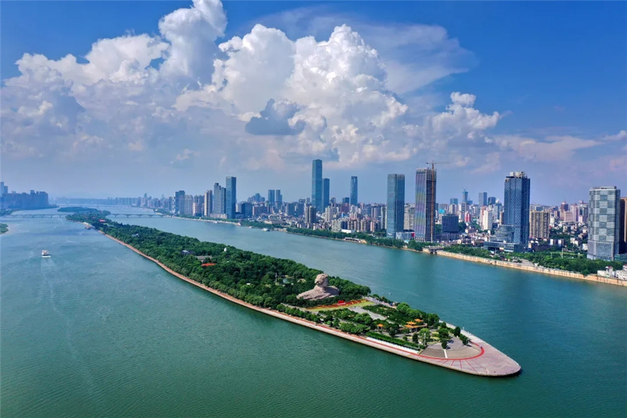 蓝天白云下的长沙橘子洲头与湘江两岸。湖南日报全媒体首席记者 郭立亮 摄