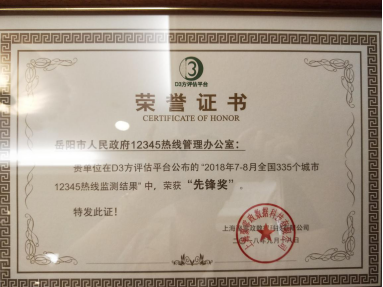 “2018全国12345政府服务热线峰会”是由第三方平台(D3方)与零点有数主办,上海市民服务热线、中国电信影子数据协办,来自全国各地123家单位280人参加。“先锋奖”是根据D3方评估平台公布的“2018年7月-8月全国335个城市12345热线检测结果”进行评定的,在全国335个城市热线中,岳阳12345热线服务质量位居全国14位,荣获“先锋奖”。