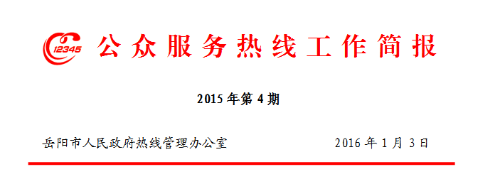 ◆2015年度岳阳市12345公众服务热线 “电话问政”活动共举办20场,受理问政362件,办结率100%,群众满意率95%以上,活动再次荣获全国政府门户网站政民互动类“精品栏目奖”。