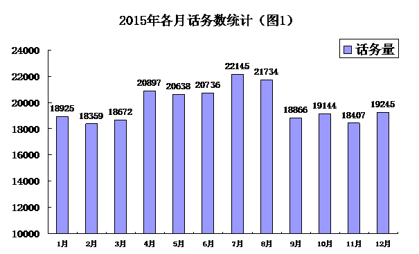 2015年12345公众服务热线共受理市民诉求237768件,其中在线办结118845件,责任单位承办工单118923件,工单数同比增加5766件,办结率为99.01%,回访工单7423件,回访满意率86.74%,每个月话务数统计见图1。