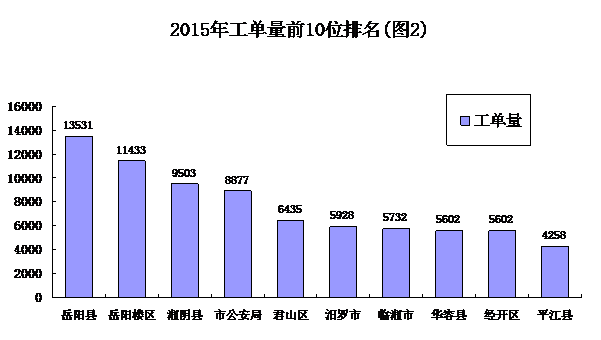 承办统计 各县(市)区中工单办理数排在前五位的是:岳阳县政府(13531件)、岳阳楼区政府(11433件)、湘阴县政府(9503件)、君山区政府(6435件)和汨罗市政府(5928件)。市直单位办理数排在前五位的是:市公安局(8877件)、市城管局(3949件)、岳阳供电公司(3598件)、市交通局(3322件)和市自来水公司(2147件)。2015年工单量前10位见图2。