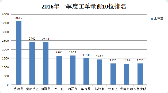 承办统计 各县(市)区中工单办理数排在前五位的是:岳阳县政府(3612件)、岳阳楼区政府(2442件)、湘阴县政府(2424件)、君山区政府(1652件)和汨罗市政府(1521件)。市直单位办理数排在前五位的是:市交警支队(1211件)、岳阳供电公司(1198件)、市公安局(966件)、市城管局(933件)和市自来水公司(809件)。2016年一季度工单量前10位见图。