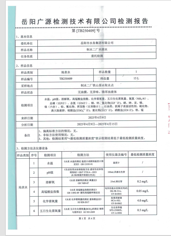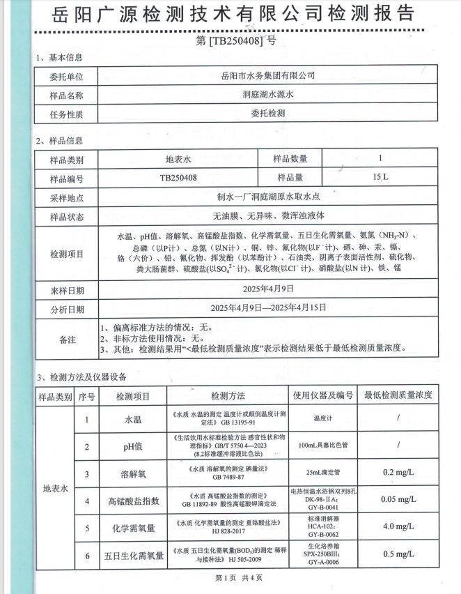 2025年4月岳阳市水务集团水源水水质检测月报表