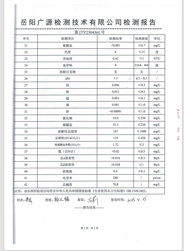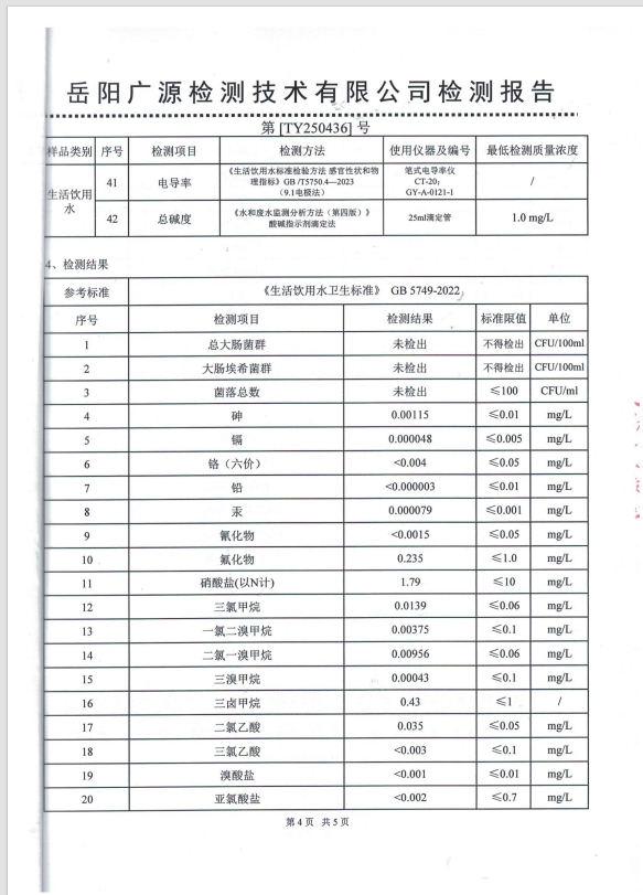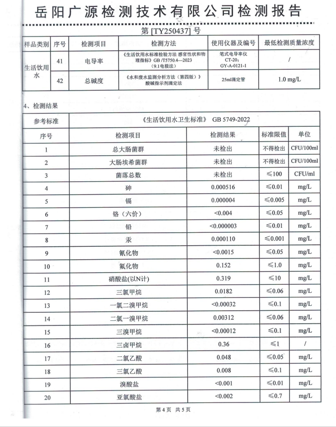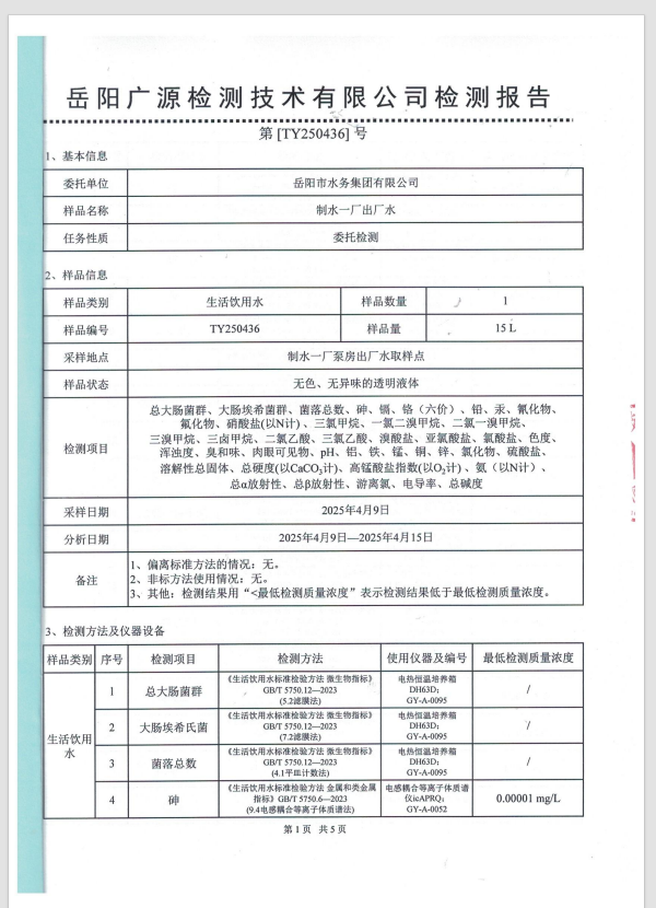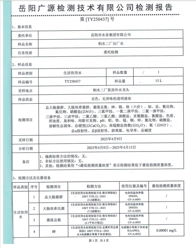 2025年4月岳阳市水务集团出厂水水质检测月报表