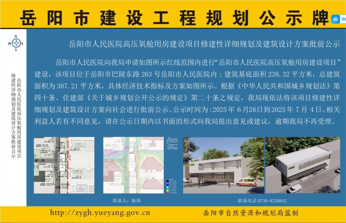 岳阳市人民医院高压氧舱用房建设项目修建性详细规划及建筑设计方案批前公示