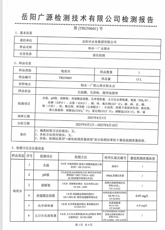 2025年6月岳阳市水务集团水源水水质检测月报表