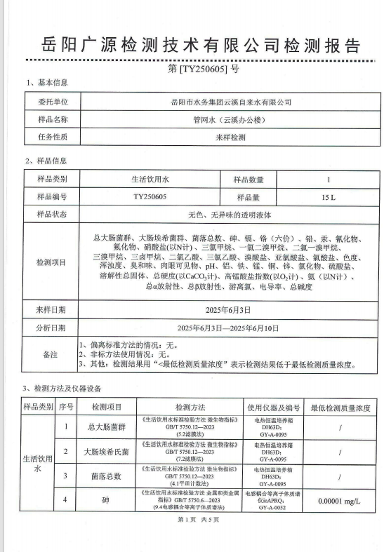 2025年6月岳阳市水务集团管网水水质检测月报表