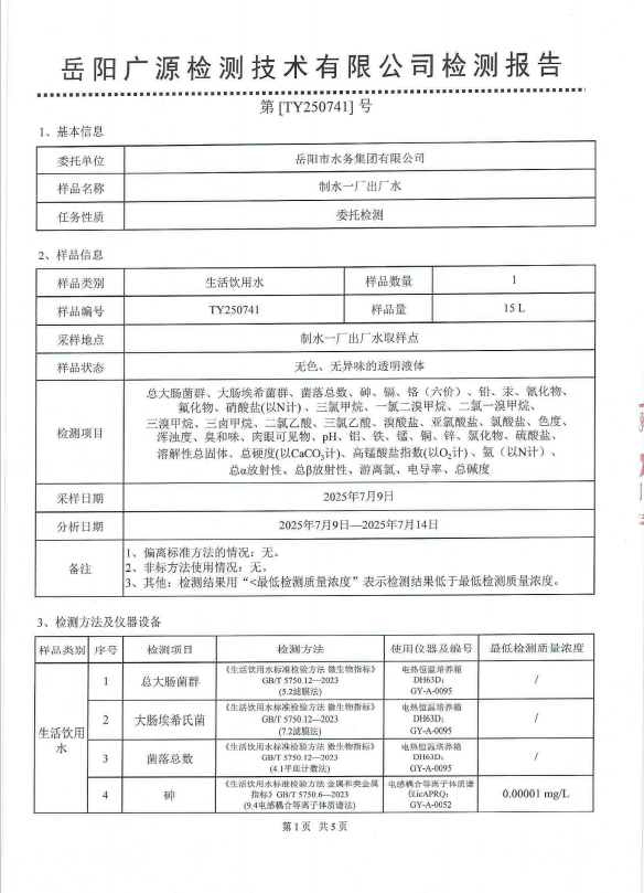 2025年7月岳阳市水务集团出厂水水质检测月报表