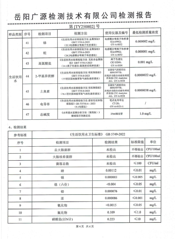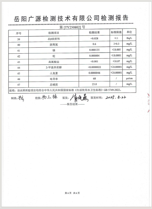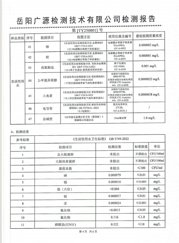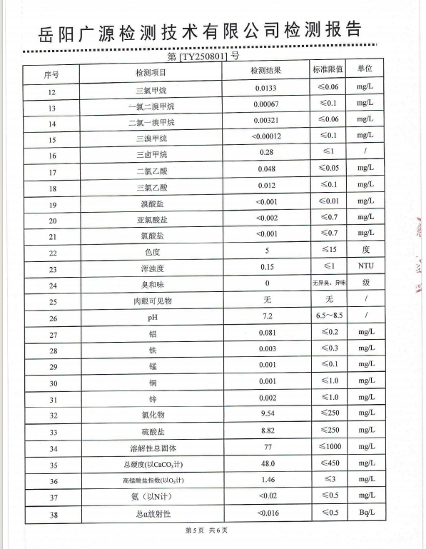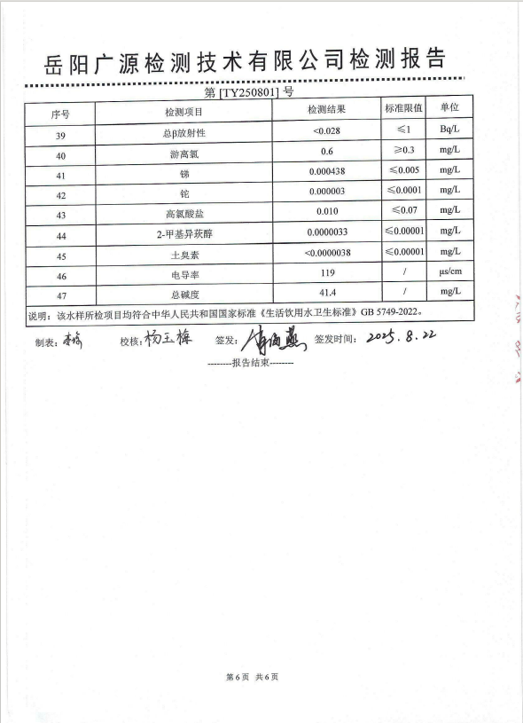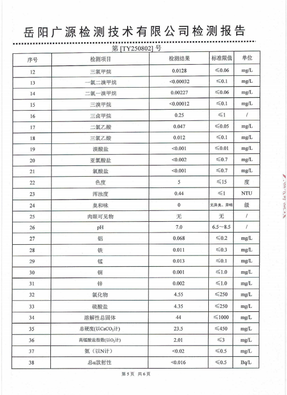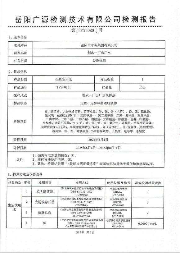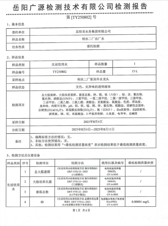 2025年8月岳阳市水务集团出厂水水质检测月报表