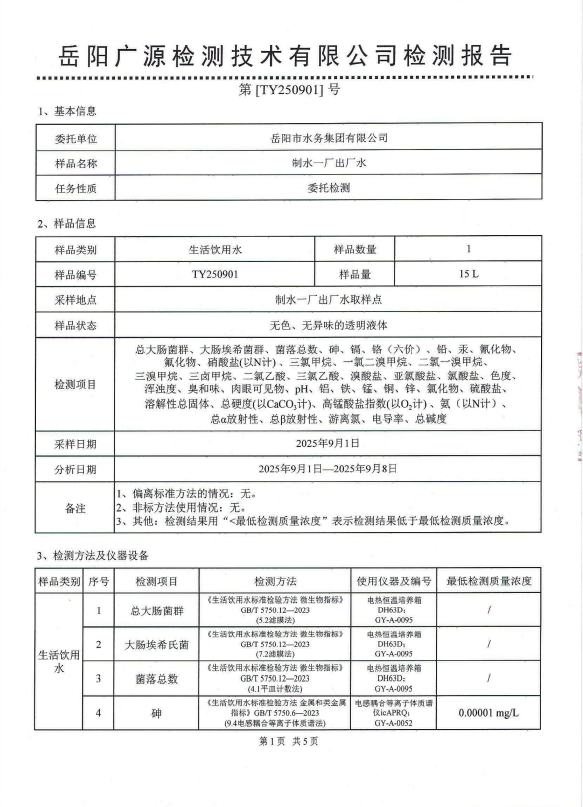 2025年9月岳阳市水务集团出厂水水质检测月报表