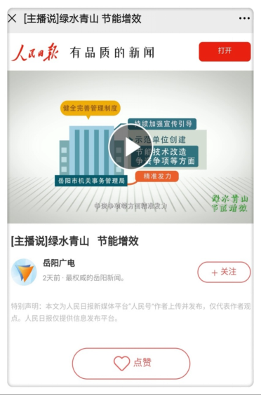 为深化宣传效果,市机关事务管理局还制作全市公共机构宣传周公益宣传视频8条,并会同岳阳电视台同步制作《主播说--公共机构节能》专题宣传片两期,分别在人民日报新闻客户端、学习强国APP、今日头条、岳阳日报、岳阳电视台、岳阳日报官方抖音号等推送、发布,在全市公共机构视频窗口滚动宣传。目前,岳阳日报公共机构节能专栏,流量112万,《主播说--节能》两期,点击量21万。广泛传播生态文明、绿色发展、节能降耗理念,营造节约能源资源、机关率先示范的良好氛围。