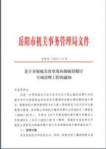 二是积极推行反食品浪费行动。2021年全面展开党政机关食堂及内部接待餐厅专项清理,由市机关事务管理局会同纪检部门对党政机关食堂“厉行节约.杜绝浪费”、“光盘行动”、“限塑令”活动开展情况、公务接待情况逐一督查,对存在问题建立台账、逐一整改、逐一销号。