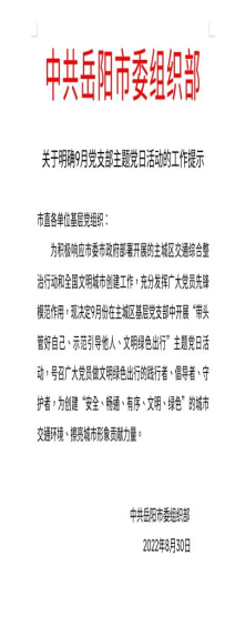 确立绿色低碳出行与中心工作结合、与文明创建契合、与基层党建融合的基本理念,倡导部门合力推动公共机构率先垂范。7月,市政府组织相关部门召开“绿色出行”专题调度会议,将公共机构低碳出行纳入文明单位创建、节约型机关创建、党建工作综合考评内容,考评范围延伸到市城区公共机构、中央和省市属企业、基层党组织和各行业产业工会组织。市机关事务管理局联合市发改委、市财政局、市生态环境局印发《关于深入开展全市公共机构绿色低碳引领行动有关工作的通知》,联合市文明办、市总工会、市国资委、市交通局印发《2022年岳阳市“低碳生活·绿色出行”活动方案》,市委组织部专题印发《关于明确9月党支部主题党日活动的工作提示》,明确市直各单位基层党组织在9月集中开展“带头管好自己、示范引导他人、文明绿色出行”主题党日活动,要求公共机构党员干部、工会会员要带头采用节约能源、提高能效、减少污染、有益健康、兼顾效率的“135”低碳出行方式,以公共机构带头示范进而带动社会营造绿色出行新风尚。8月以来,结合迎接国家文明城市复查和举办省第十四届运动会,市文明办等单位联合发出倡议并每日随机督导城区公共机构绿色、文明出行情况,推进公共机构绿色出行落地落实。