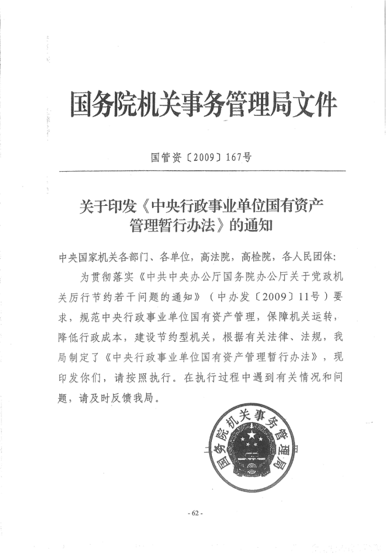 关于印发《中央行政事业单位国有资产管理暂行办法》的通知(国管资(2009)167号)