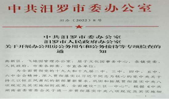 为贯彻落实中央八项规定及其实施细则成果,2022年3月,汨罗市机关事务服务中心经汨罗市市委市政府批准同意,研究部署专项检查实施方案,从市委督查室、市纪委监委、市机关事务服务中心等部门抽调20余人组成联合检查组,对全市59个市直机关单位和15个乡镇开展为期一个月的专项检查,重点围绕办公用房面积是否超标、公务接待是否违规、公务用车派车是否规范,公共节能是否降耗等问题深入检查,采取量面积、查帐目、干部座谈、听取意见的方式直指问题,形成问题清单限期整改,并对问题突出、整改不到位的相关单位移交市纪委监委处理。