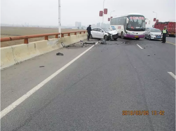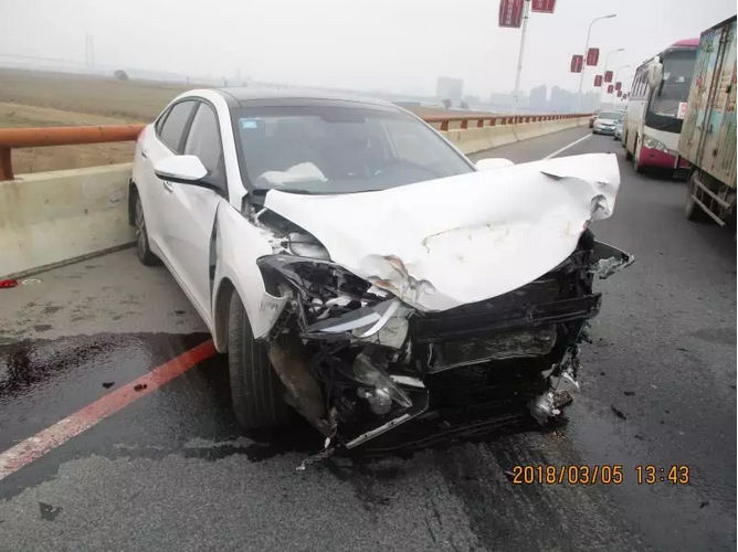 2018年03月05日13时30分,交警君山大队接到报警称:一小型轿车在洞庭湖大桥97号路灯处发生交通事故,车辆受损严重。接到报警后,事故民警侯迁和、钟余良、辅警龚智勇立即赶往事故现场,车上人员已经被救护车送往医院。经勘察,事故车辆牌号为赣FCXXX3,车头严重受损,安全气囊全部弹出,民警心想,车上人员应该伤得不轻。但是民警联系驾驶员后,得知驾驶员并无大碍,下午会来大队处理相关事宜。