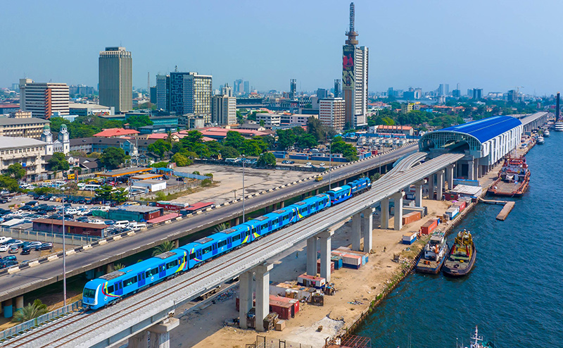 这是尼日利亚拉各斯轻轨蓝线上的一列轻轨列车(2022年12月21日摄,无人机照片)。新华社发(托普·阿尤库?摄)