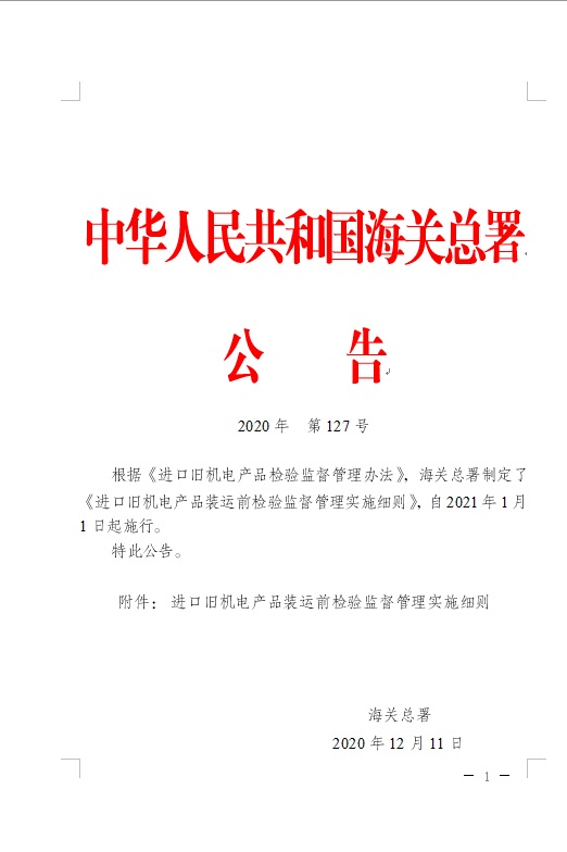 为加强和规范对进口旧机电产品装运前检验活动和装运前检验机构的监督管理,海关总署发布2020年第127号公告《海关总署关于发布<进口旧机电产品装运前检验监督管理实施细则>的公告》。现对公告内容进行解读,供广大进出口企业和装运前检验机构参考。