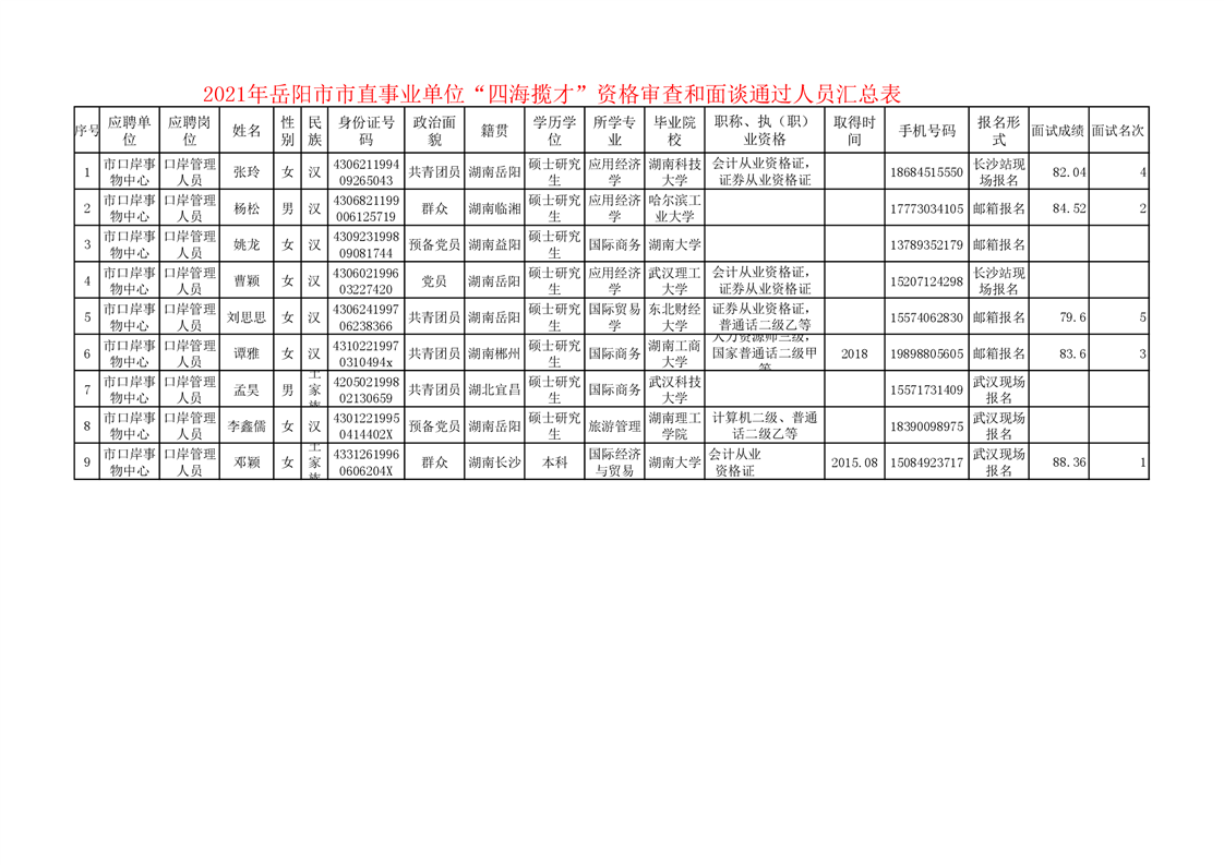 2021年岳阳市市直事业单位“四海揽才”资格审查和面谈通过人员汇总表
