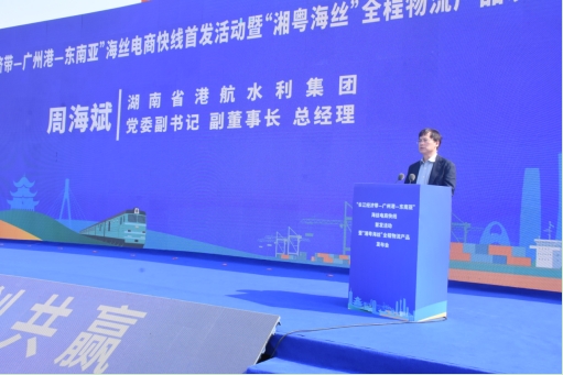 周海斌在讲话中表示,“长江经济带-广州港-东南亚”海丝电商快线首发仪式暨“湘粤海丝”全程物流产品发布会是落实党的二十届三中全会和中央经济工作会议决策部署的生动实践,也是湘粤两地深度合作的丰硕成果。湖南港航水利集团将充分发挥自身优势,全面推进快线建设,深化智慧融合,提高服务水平,强化市场拓展,为打造“中部陆海大通道”贡献力量。