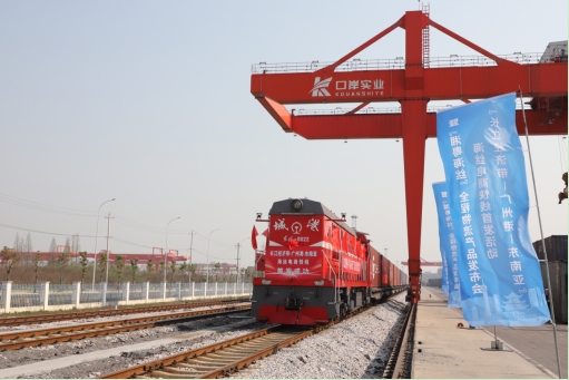 10时8分,随着一声汽笛长鸣,一列搭载30柜美的冰箱的班列从岳阳城陵矶新港多式联运物流园缓缓驶出,预计2天后抵达广州南沙港,随后出海运往东南亚。标志着“长江经济带-广州港-东南亚”海丝电商快线正式开通。