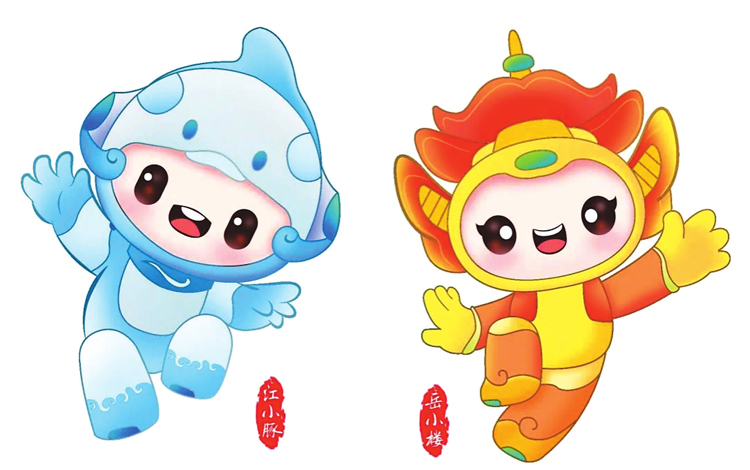 吉祥物为“江小豚、岳小楼”,江小豚灵感源自岳阳特有的保护动物——江豚,岳小楼灵感源自岳阳楼这一标志性建筑。它们面带微笑、张开双臂,仿佛在热情欢迎每一位游客的到来。