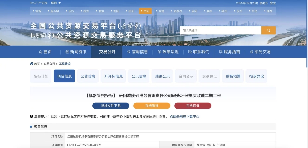 2月28日,全省首个水运“机器管招投标”项目——岳阳城陵矶港务有限责任公司码头环保提质改造二期工程11#泊位及后方堆场改造标段施工挂网,将通过岳阳市本地部署的“机器管招投标”系统完成交易,标志着岳阳首个“机器管招投标”系统正式上线运行。