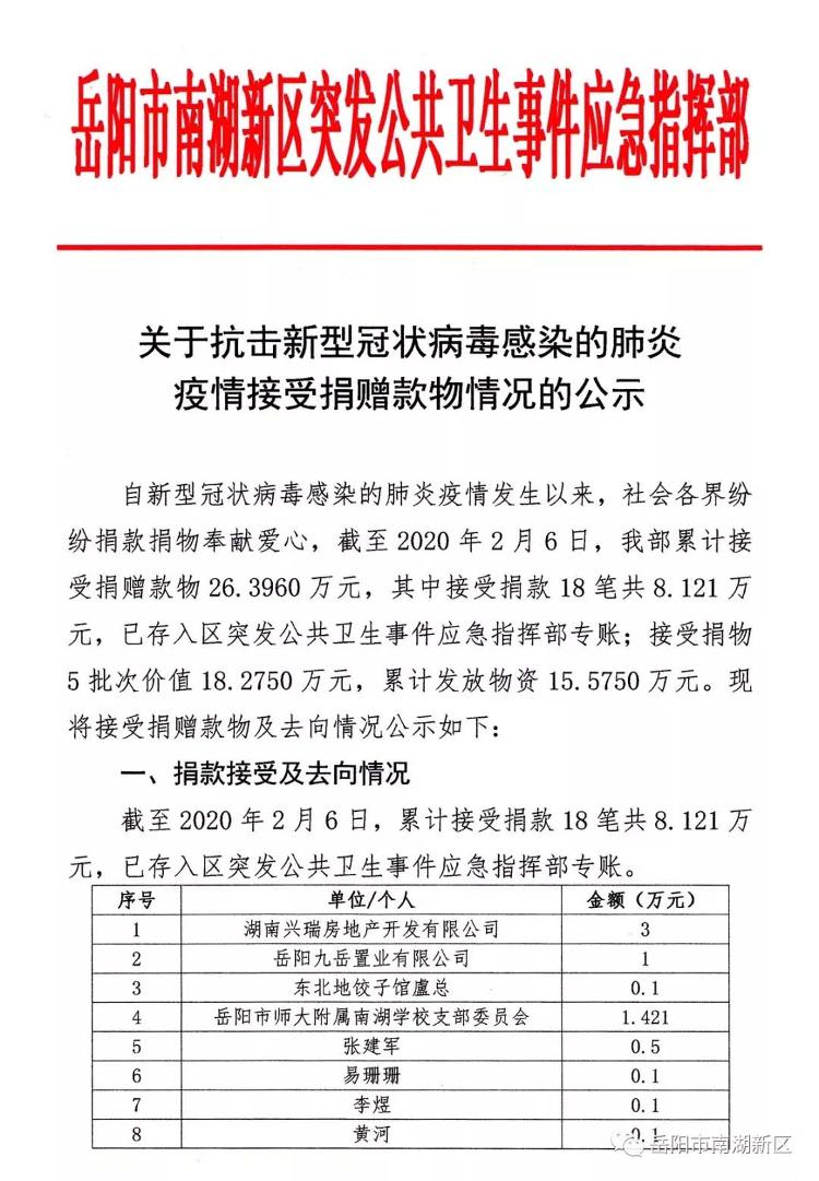 南湖新区关于抗击新型冠状病毒感染的肺炎疫情接受捐赠款物情况的公示(一)