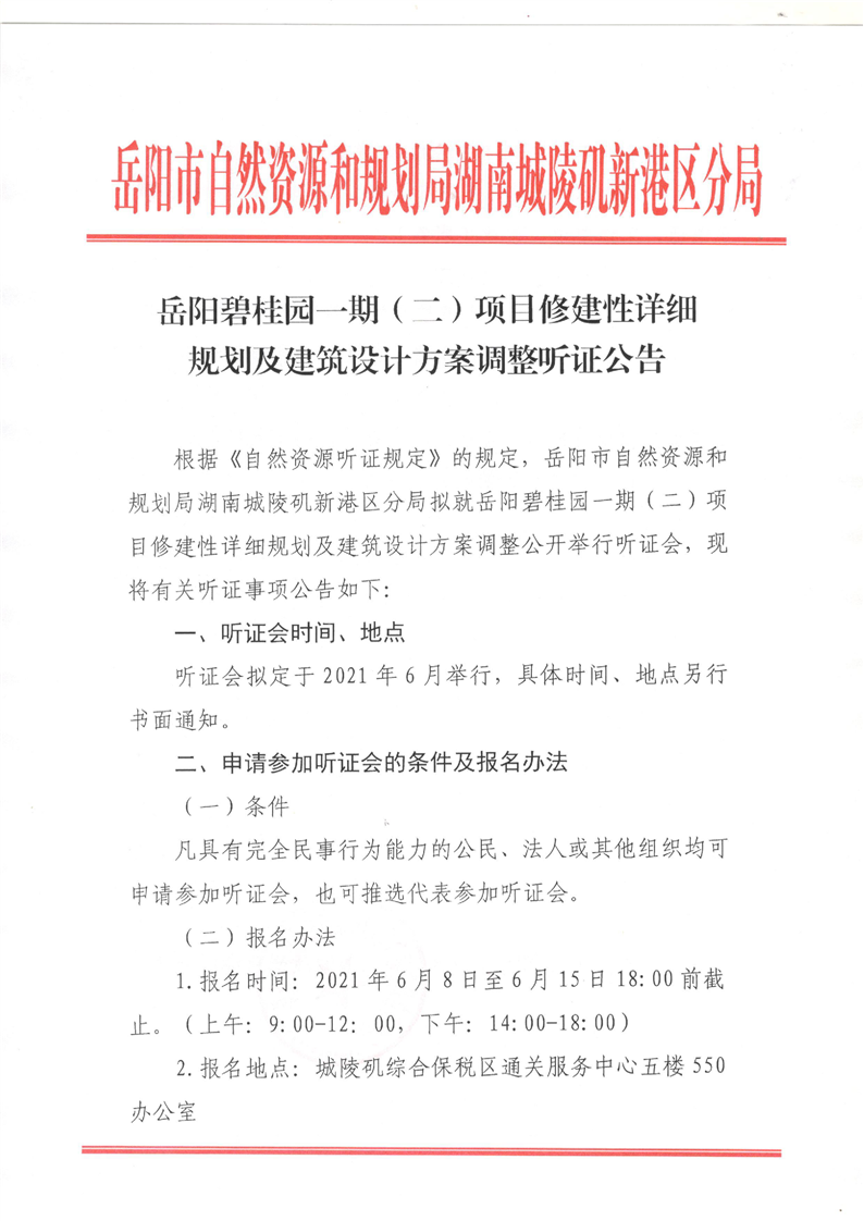 岳阳碧桂园一期(二)项目修建性详细规划及建筑设计方案调整听证公告