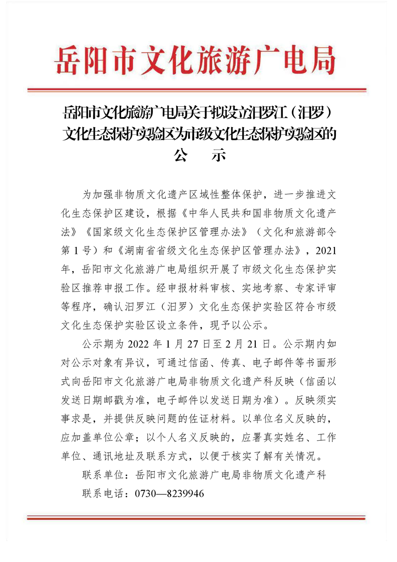 岳阳市文化旅游广电局关于拟设立汨罗江(汨罗)文化生态保护实验区为市级文化生态保护实验区的公示