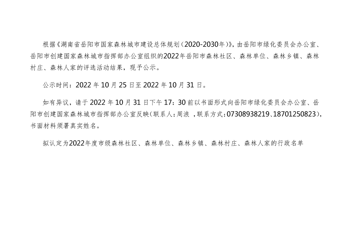 岳阳市森林社区、森林单位、森林乡镇、森林村庄、森林人家等森林示范评选活动结果公示
