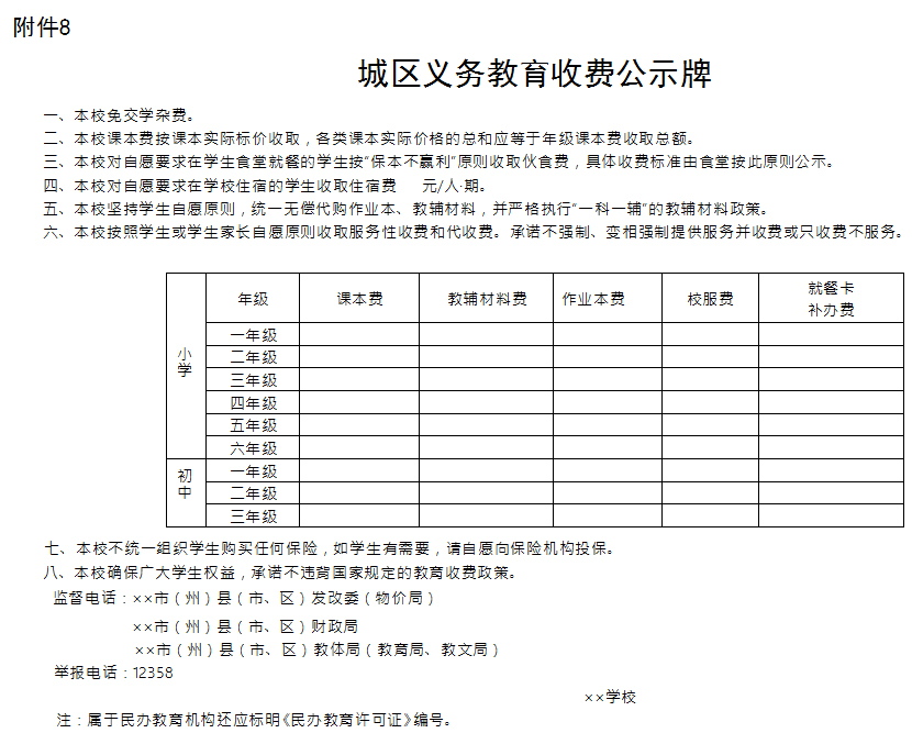 2、城市学校可按规定向学生收取课本费和作业本费,向自愿接受相关服务的学生收取教辅材料费、住宿费、伙食费、校服费、就餐卡补办费、校外活动费,除此之外,不得另行收取其他费用。