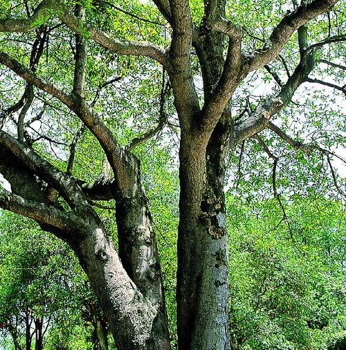 市树杜英 又名冬桃、胆八、羊屎果、山杜英。杜英科,常绿乔木,主干挺拔,高可达20多米,树冠广阔,枝繁叶茂。树皮灰黑色,叶薄革质,长4~12厘米,宽1.6~3厘米,呈倒卵状椭圆形,边缘疏生钝锯齿。6~7月开花,总状花序,腋生,黄白色。11月果熟,核果,圆形。果肉可食,是鸟类佳肴。杜英树喜温暖湿润环境,幼苗不甚耐寒,持续零下4℃时有枯梢现象,但不影响正常生长。适于微酸性土壤和中性土壤,PH值0.5~7.0,生长良好。种子容易采集,发芽率较高,以播种育苗为主,也可扦插、压条繁殖。秋季移植以11月中旬为宜,须防止异常冰冻为害;春季栽植以3月上旬至4月上旬较为合适。木材灰褐色,纹理直,结构紧密,干缩强度小,切削容易。为建筑梁柱、家具、文具、胶合板原料。树头、树梢、枝丫为培养香菇的好原料。湖南省主要经济树种,是理想的庭院风景林树种。岳阳人喜爱杜英,因为它干形高大,蓬勃向上,整个树叶红绿相间,相互交织在一起,非常美观。老叶在凋落之前变成红色,四季如此,无花胜有花,颇有“红花绿叶春常在”之感。文人雅士为杜英起了一个雅号,叫丹青树。若把掉下的红叶,夹入书中,火红刷亮,久不褪色,既可作书签,也是一种独特的旅游纪念品。