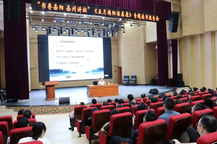 5月27日下午,岳阳市图书馆一楼多功能报告厅座无虚席,由市图书馆举办的“岳州讲坛”——端午专题读书报告会在此举行,岳阳市委党校二级巡视员、教授刘宇赤应邀作主题讲座。岳阳市图书馆学会成员单位代表、岳阳市民进会员及民进“同心家园藏汉一家亲”的藏族学生、岳阳市图书馆全体员工、岳阳市电大部分学生以及各界读者朋友参加。