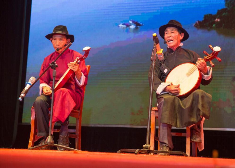 头戴礼帽,身着马褂,怀抱月琴,方言坐唱。一曲醇厚古朴的“河市道情”弹唱出《屈原美》,两位表演者是来自屈原管理区河市镇古罗城村湛春华和凤凰乡河泊潭村宋加仁,他们是地地道道的农民,同时也是河市道情河夹塘唱腔的传承人。当晚,他们带着“河市道情”首次亮相文艺大舞台。也是第一次创新,实现了二人联唱。