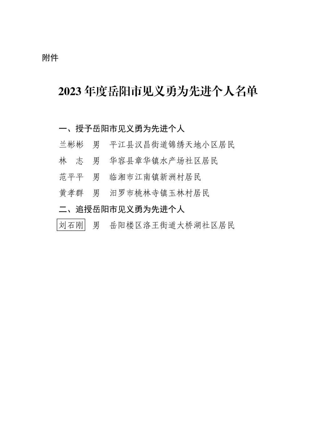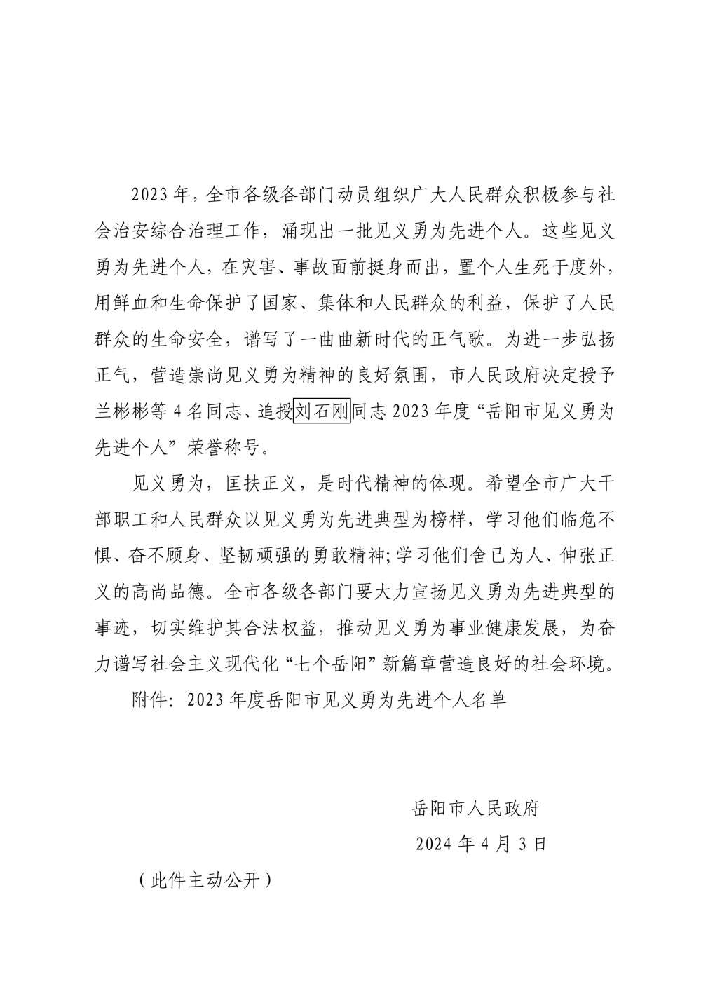 岳阳市人民政府关于2023年度岳阳市见义勇为先进个人的表扬通报