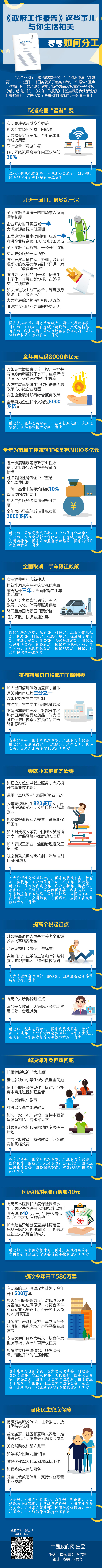 “为企业和个人减税8000多亿元”“取消流量‘漫游费’”……近日,《国务院关于落实<政府工作报告>重点工作部门分工的意见》发布,12个方面57项重点任务逐项分解、明确责任。《政府工作报告》中这些跟你我生活密切相关的事儿,谁来落实?快来和中国政府网一起看一看!