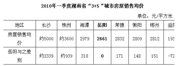 作为强关联的房地产业,仅是低碳经济的一个发展方向,又是提升城市品位,带动多行业发展,促进经济质量提高的一个重要方面。岳阳市区具有大湖大江独特的地理优势,是发展房地产业的理想家园,而目前岳阳房地产业相对比其他同级城市却存在发展较慢,商品房价格偏低的问题。2009年岳阳市区房地产投资27.92亿元,同比负增长11.65%,增幅在全省十四城市市区中排名倒数第一,房地产投资占城镇投资的比重为19.6%,远远低于全省67.8%的平均水平,排名倒数第二,仅高于衡阳市区0.2个百分点。2010年一季度岳阳市区房屋销售均价2661元/平方米,仅高于益阳1936元/平方米,位居“3+5”城市倒数第二。长沙2006年房屋销售均价就达到了2991元,目前均价约在5000元左右,远远高于岳阳。