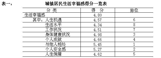 城镇居民生活幸福感分别就人生机遇、生活水平、工作状况、身体健康状况、个人成就、与他人相处、个人安全感及人生保障8个方面进行打分。从调查的情况看,城镇居民生活幸福感总得分为4.80分(满分7分),按百分制计算,达到68.6分,处于中上水平(详见表一)。