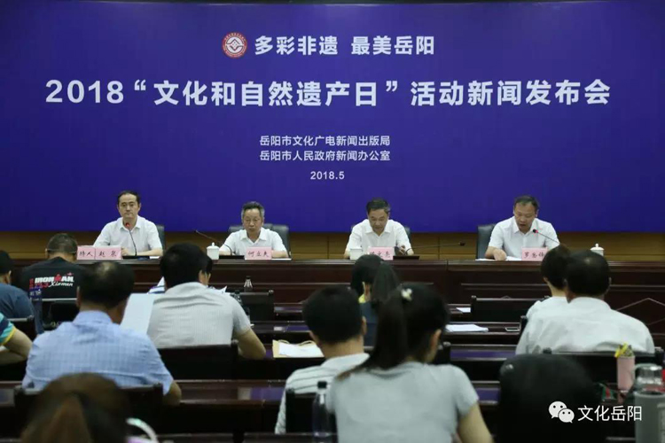 5月30日上午,“多彩非遗 最美岳阳”——岳阳市2018年“文化和自然遗产日”系列宣传活动新闻发布会,在岳阳文化艺术会展中心二楼新闻发布厅举行。岳阳市人民政府副秘书长陈文亮,市文广新局党组副书记、副局长何立夫,党组成员、副局长罗岳锋出席发布会介绍相关情况、回答记者提问。岳阳市政府新闻办主任赵泉主持新闻发布会。