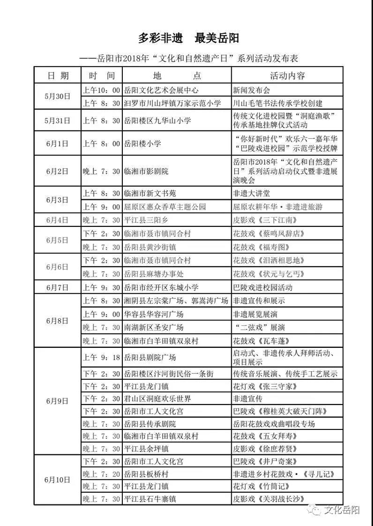 今年6月9日是我国第二个“文化和自然遗产日”,为了让人民群众共享非遗保护成果,当好非遗保护的薪火传人,经岳阳市人民政府同意,将在“文化和自然遗产日”前后,举办“多彩非遗 最美岳阳”——岳阳市2018年“文化和自然遗产日”系列宣传活动。
